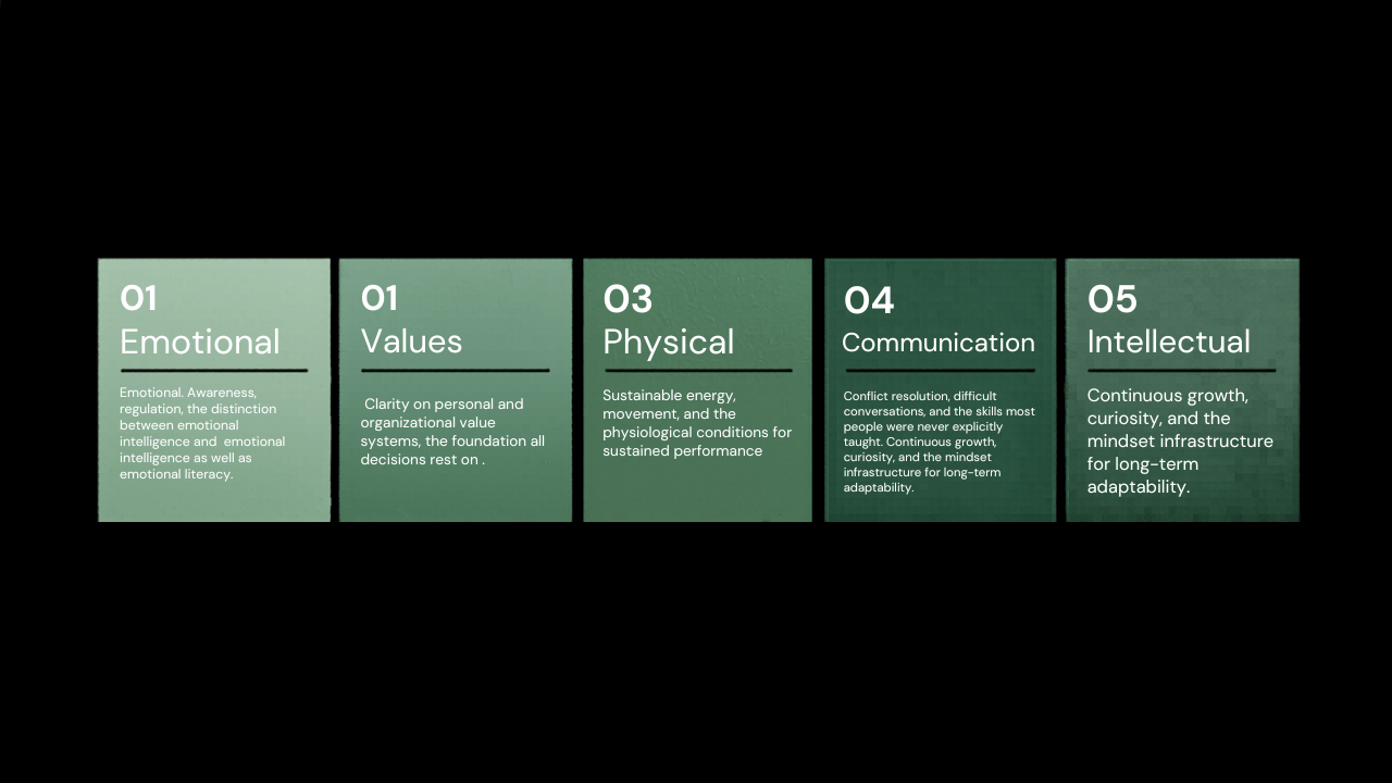 Drawing on Montessori principles of intrinsic motivation and developmental appropriateness, this curriculum addresses the human layer that determines organizational performance.