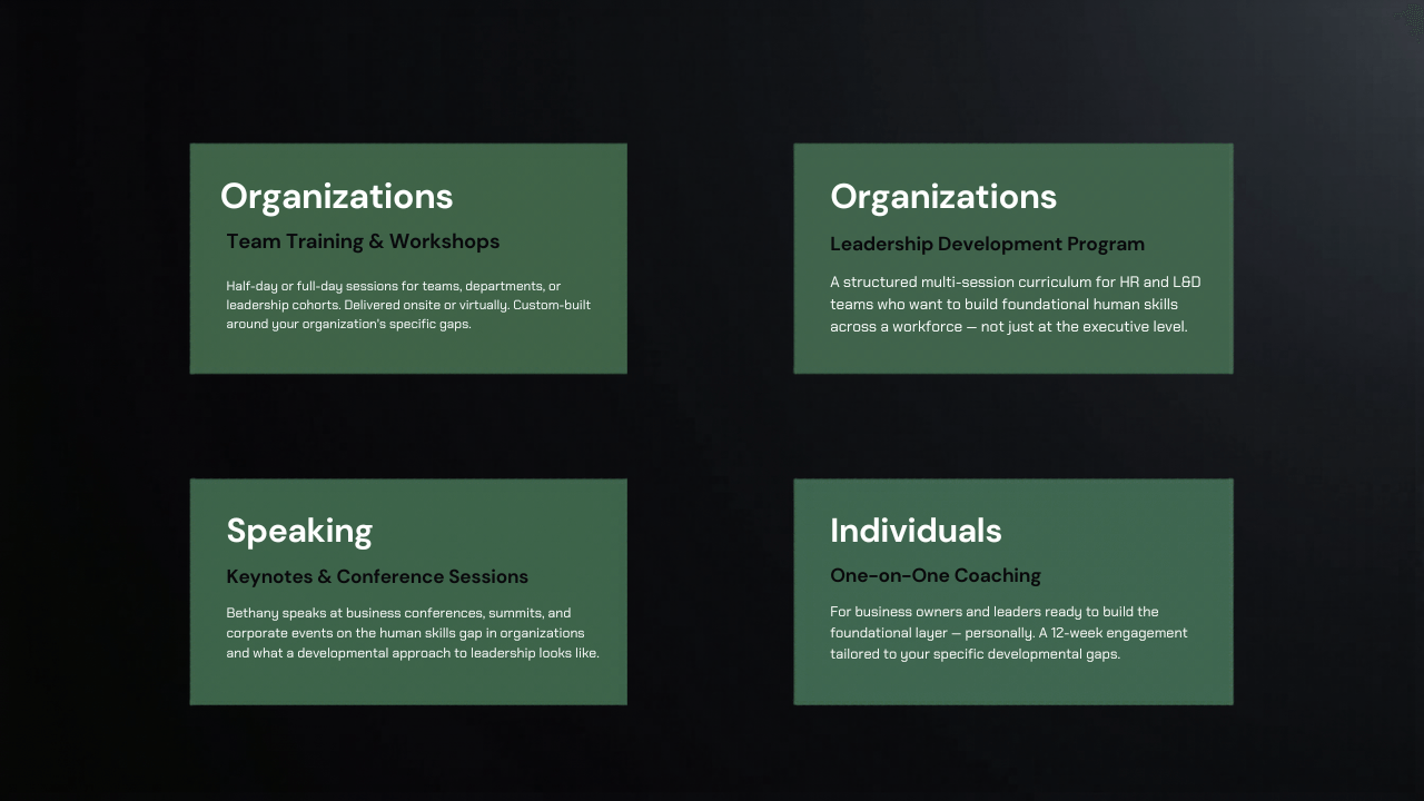 Most coaches teach concepts. Bethany builds curriculum. Structured, sequenced, developmentally appropriate systems for how adults actually learn and change. That distinction matters when you're trying to shift behavior across a team, not just inspire it in a room.